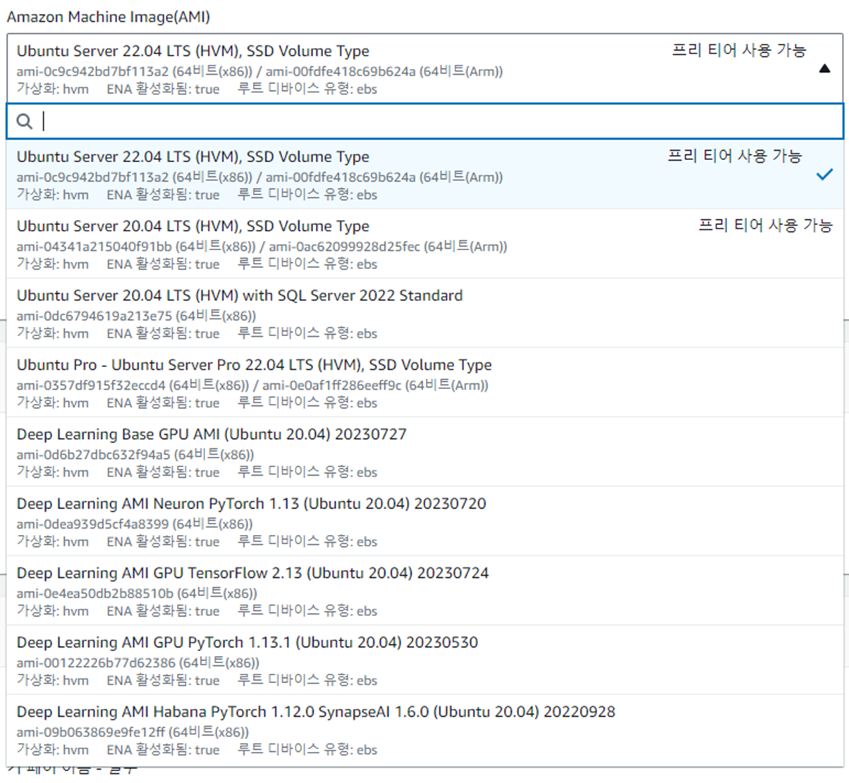 AMI 토글을 눌러 다양한 AMI를 선택 할 수 있다.
