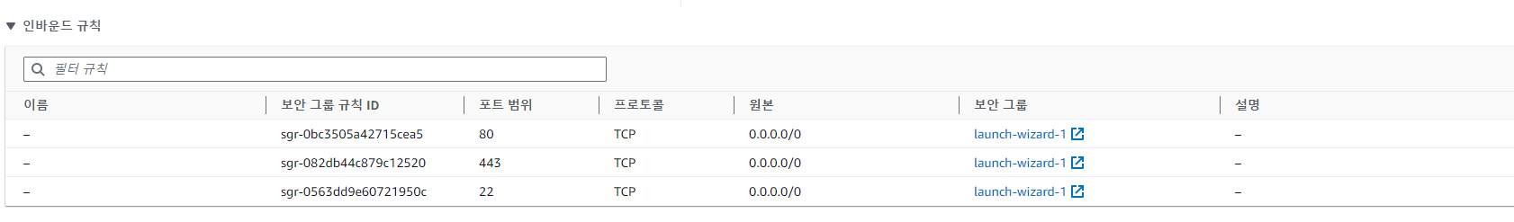 인스턴스 > 보안 그룹에서 인바운드 규칙에 새로운 규칙이 추가 되었는지 확인한다.