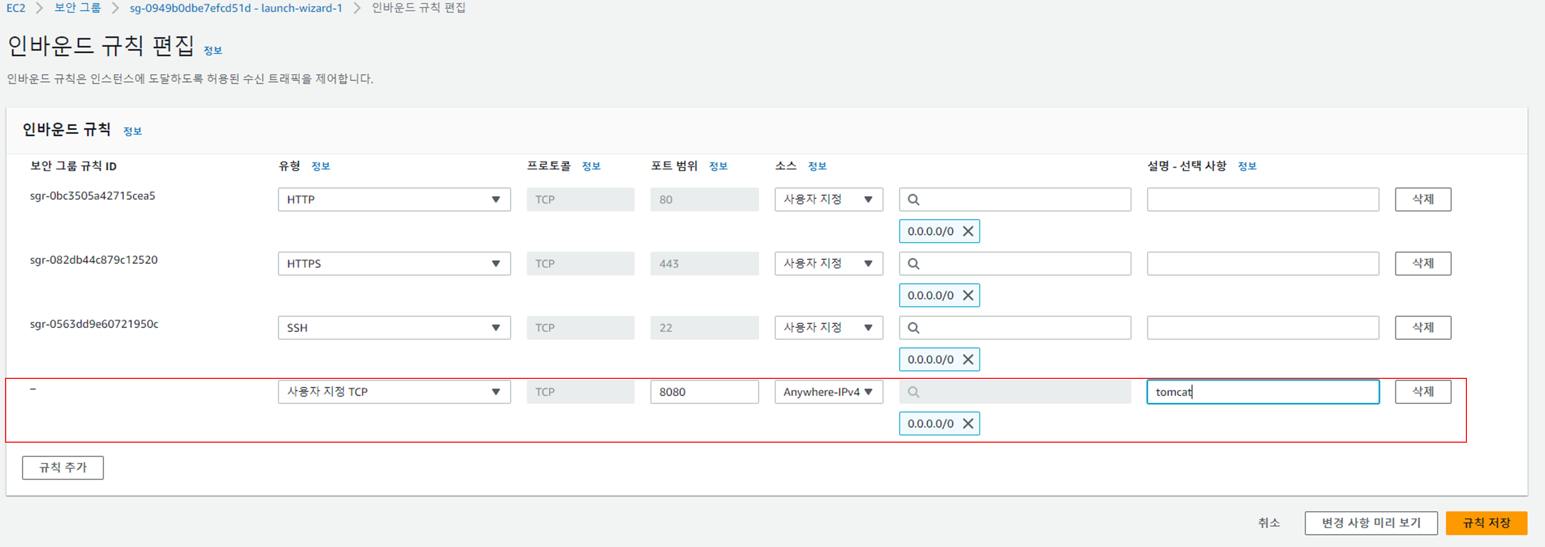 규칙추가 클릭 > 유형에 사용자 지정 TCP 선택 > 포트범위 8080 > 소스 > anywhere-ip4 > 설명에 tomcat (선택사항)