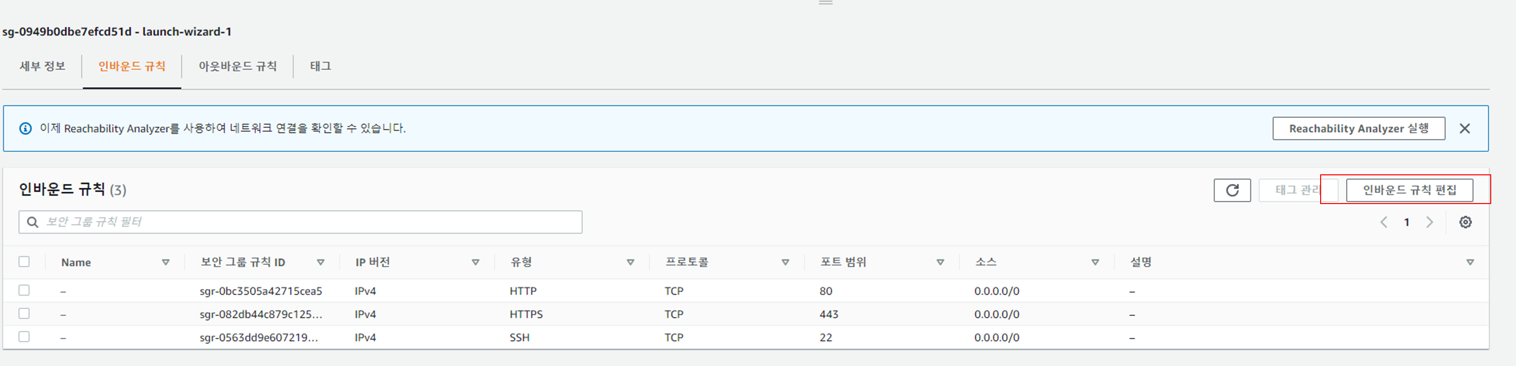 설정된 보안 그룹을 확인하고 인바운드 규칙 > 인바운드 규칙 편집 을 클릭