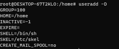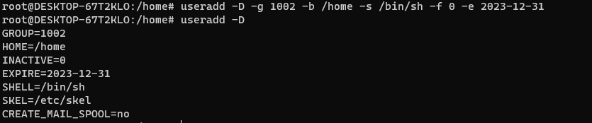 # useradd -D -g 1002 -b /home -s /bin/sh -f 0 -e 2023-12-31