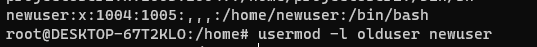 계정명이 바뀐 걸 확인할 수 있다. 하지만 홈 디렉터리를 변경하지 않아 기존의 newuser 디렉토리가 그대로